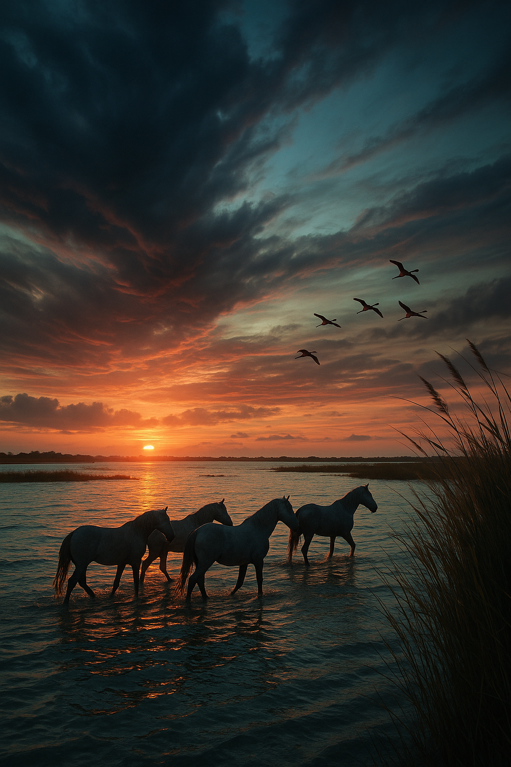 La Camargue, vaste et sauvage, chante la liberté : chevaux, marais, sel, mistral.